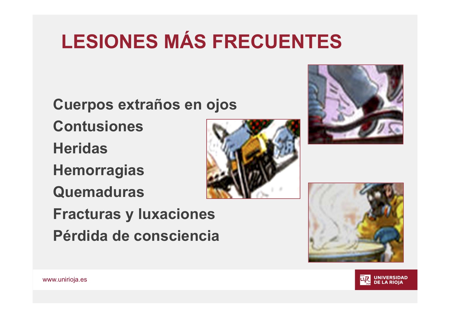 Lista desordenada Coloca en orden alfabético las siguientes lesiones:Contusiones.Cuerpos extraños en ojos.Esguinces.Fracturas.Hemorragias.Heridas.Pérdida de consciencia.Quemaduras.Comprobar¡Correcto!No es correcto... Respuesta correcta: